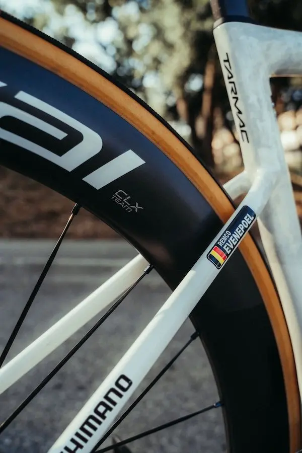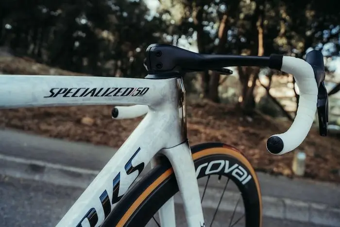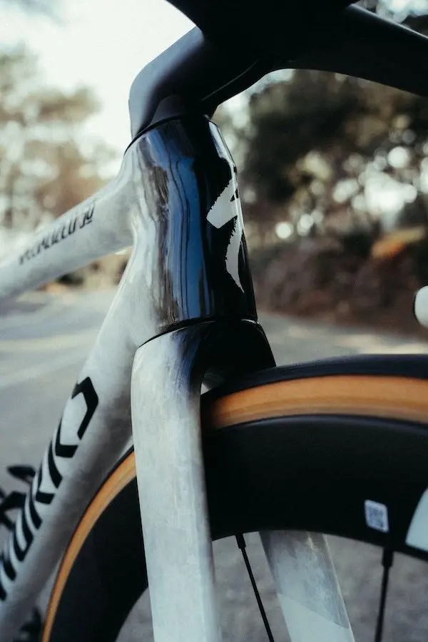 Specialized a offert à Remco Evenepoel un S-Works Tarmac SL8 au coloris spécial, pour célébrer son maillot blanc de meilleur jeune sur le Tour de France, épreuve qui l’a vu terminer troisième au classement général derrière Tadej Pogacar et Jonas Vingegaard, et sur laquelle il a également remporté une victoire d’étape. Un vélo monté en Shimano Dura-Ace, avec roues et poste de pilotage Roval, que le jeune Belge ne devrait pas avoir l’occasion d’étrenner en compétition, mais qu’il devrait conserver pour sa collection personnelle.