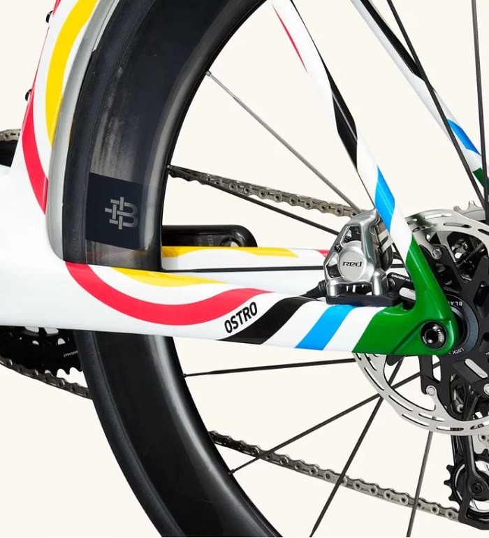 L’édition OSTRO VAM 1900 poursuit cette tradition de célébration de l’innovation en se consacrant à la haute performance. Les cercles concentriques colorés représentent l’objectif commun des athlètes qui roulent avec des modèles de la marque, tandis que les bords extérieurs flous soulignent leur dynamisme et leur vitesse en plein vol.