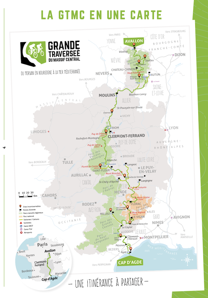Fruit de l’imagination d’acteurs locaux souhaitant promouvoir la beauté de leurs territoires encore méconnus, la Grande Traversée du Massif Central (GTMC) s’est rapidement imposée, depuis sa création en 1995, comme un parcours incontournable de par sa longueur exceptionnelle (1 400 kilomètres entre Avallon et le Cap d’Agde) et la diversité hors du commun des espaces naturels rencontrés. Itinéraire de référence favorisant le dépaysement pour certains, parcours de légende pour d’autres, la GTMC offre l’opportunité aux sportifs comme aux familles de pédaler au rythme de rencontres authentiques et de découvertes de lieux préservés.