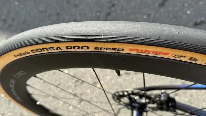 Cette efficacité ne se retrouve pas au détriment d’une faible adhérence. Sur un bitume légèrement humide, je n’ai jamais eu la sensation de patiner de la roue arrière, même en relançant franchement. La bande de roulement semble toujours en contact avec le sol, même en allégeant au maximum la roue arrière lors des passages en danseuse. Et dans les virages, qu’ils soient rapides ou serrés, le grip est parfaitement rassurant. La gomme tendre des Corsa Pro Speed mord la route, mais sans s’y accrocher.