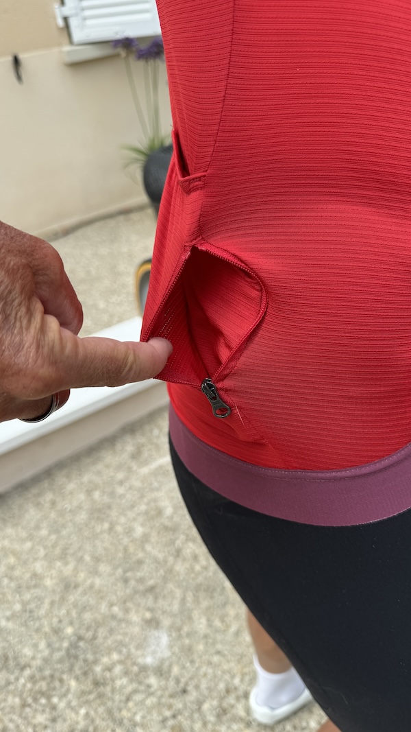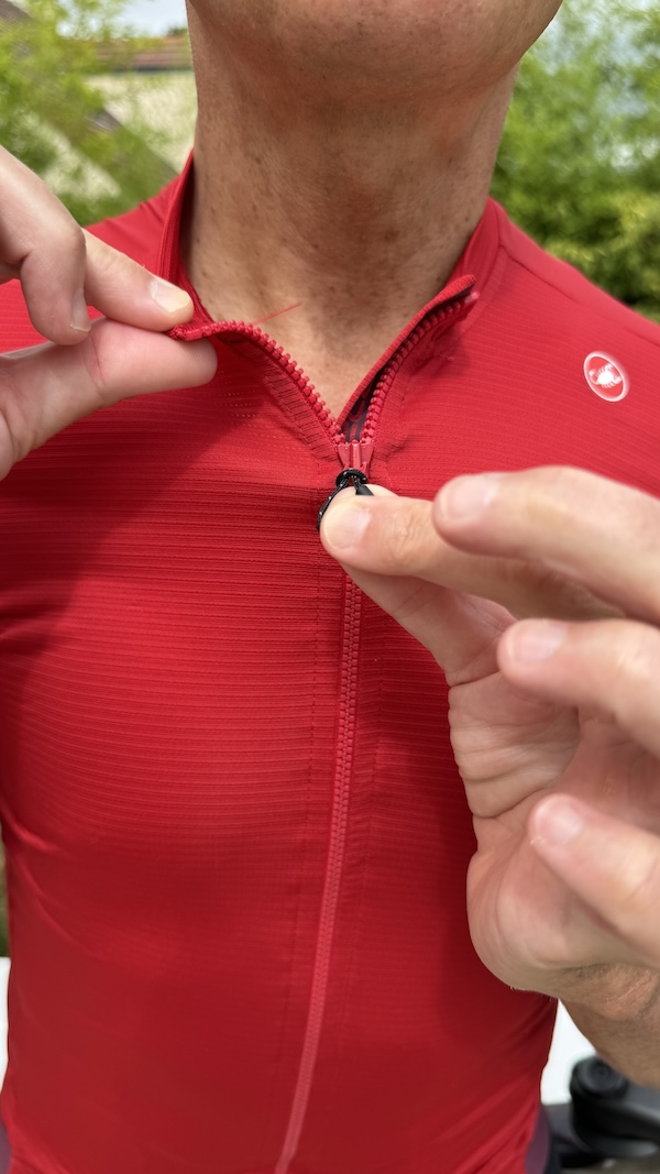 Le maillot Espresso est quant à lui conçu avec un tissu nommé Air_O Stretch, fin, léger, respirant, et étirable de telle façon qu’il s’ajuste parfaitement aux formes du buste sans serrer ni limiter les mouvements. Un tissu qui peut paraître transparent, mais qui filtre 97% des UV selon Castelli. Conformes à la mode actuelle, les manches sont longues et avec une coupe brute (sans élastique) qui tient parfaitement bien sur les bras. La fermeture éclair du maillot se manipule avec fluidité, et d’une seule main si nécessaire, par exemple pour ajuster la ventilation lors de longues montées. La tirette de la fermeture est facile à attraper avec un aspect vraiment haut de gamme. À l’arrière, on trouve trois poches assez profondes et une poche supplémentaire zippée, pour y glisser des clés ou de la monnaie. Enfin, une bande élastique à l’arrière sur le bas du maillot le maintient bien en place, même en position courbée sur le vélo. Pour cette tenue, j’ai choisi ma taille habituelle chez Castelli, à savoir du S. En enfilant le maillot, j’ai eu la sensation d’avoir un peu de marge, grâce à la souplesse du tissu. Mais au final, celui-ci s’ajuste parfaitement et ne provoque quasiment pas de plis.