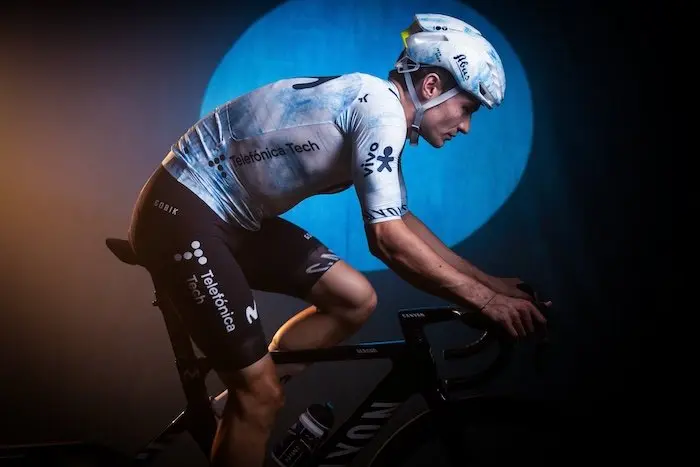 Pour cette occasion, GOBIK a conçu un maillot en édition spéciale pour l’équipe Movistar, commémorant les 100 ans de Telefónica, qui relie les gens. Ce design, fabriqué dans l’usine de Yecla, symbolise le progrès technologique et l’innovation, avec un tissu spécialement conçu pour offrir des performances professionnelles dans toutes les conditions. Le maillot est équipé des dernières avancées aérodynamiques pour optimiser chaque watt de puissance. Pesant seulement 110 grammes, il offre un ajustement et une compression musculaire maximaux et présente un design unique avec un fond blanc et des lignes bleues représentant les bâtiments emblématiques de Telefónica aux côtés des monuments les plus emblématiques de Madrid.