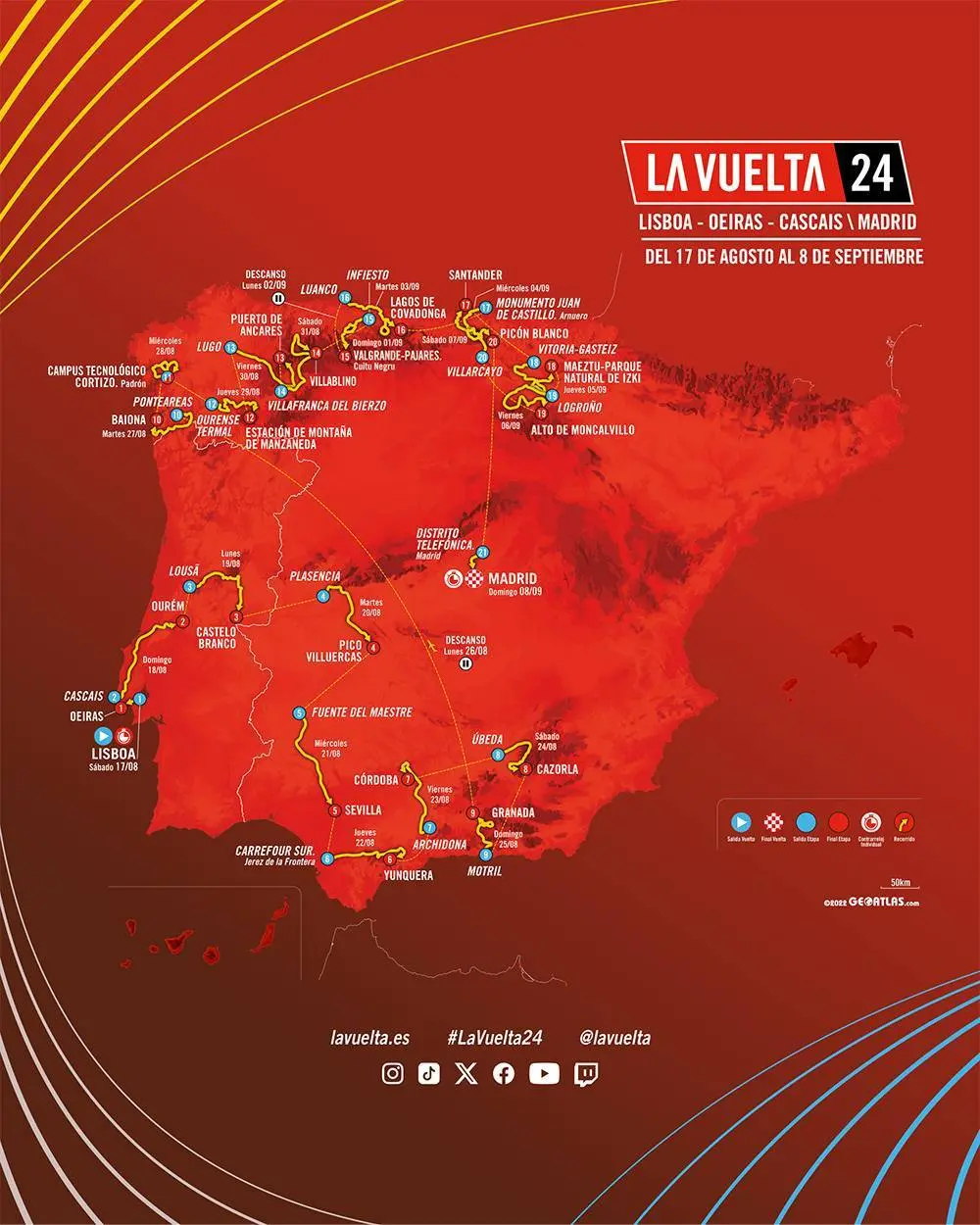 Partager la publication "Vuelta 2024 : le parcours, les cartes et profils des étapes, la liste des coureurs engagés et les horaires de diffusion TV du 79e Tour d’Espagne"