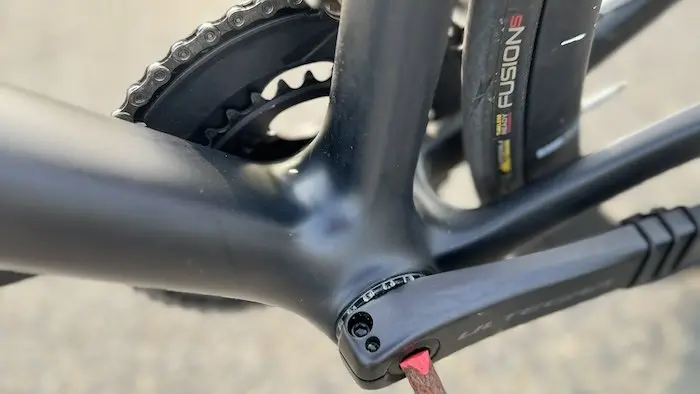 Cintre, potence (en aluminium), tige de selle (en carbone) et selle sont aussi signés Look, pour former un ensemble cohérent sans se montrer trop onéreux à 6490 €. Ces choix présentent l’avantage d’être évolutifs à l’envi, pour ceux qui désireraient par exemple changer de taille de cintre ou de potence facilement. Sous la potence, le système de bagues en deux parties permet d’ajuster facilement la hauteur du poste de pilotage sans qu’il soit nécessaire de démonter toute la câblerie. Un exemple d’utilisation du vélo et de sa maintenance dans la vraie vie, en somme !