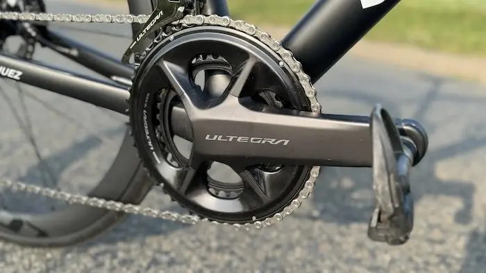 Notre vélo de test est donc la version la plus haut de gamme du 785 Huez actuel, avec le groupe électrique Shimano Ultegra Di2 12 vitesses, irréprochable que ce soit au niveau des changements de vitesse ou du freinage à disque. Une transmission qui offre les mêmes possibilités de personnalisation que le Dura-Ace, avec l’adoption ou non des changements de vitesse synchronisés ou semi-synchronisés, le choix du type d’action conférée par les boutons cachés (comme le défilement des pages du compteur/GPS compatible et/ou la mise en marche de la sonnette du nouveau compteur Garmin Edge 1050 par exemple) et de communication avec l’application Shimano E-Tube pour la maintenance du système.