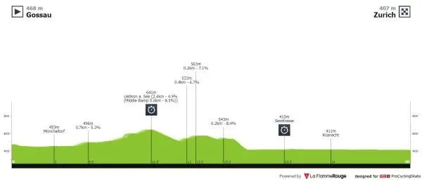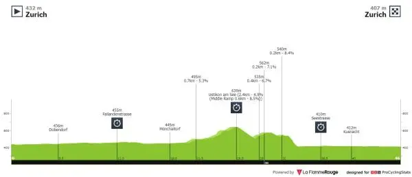 Les hommes Elites s’affronteront sur 46,1 km, avec comme principale difficulté la montée vers Uetikon am See (2,4 km à 4,9 %), avec un sommet au kilomètre 26,5.