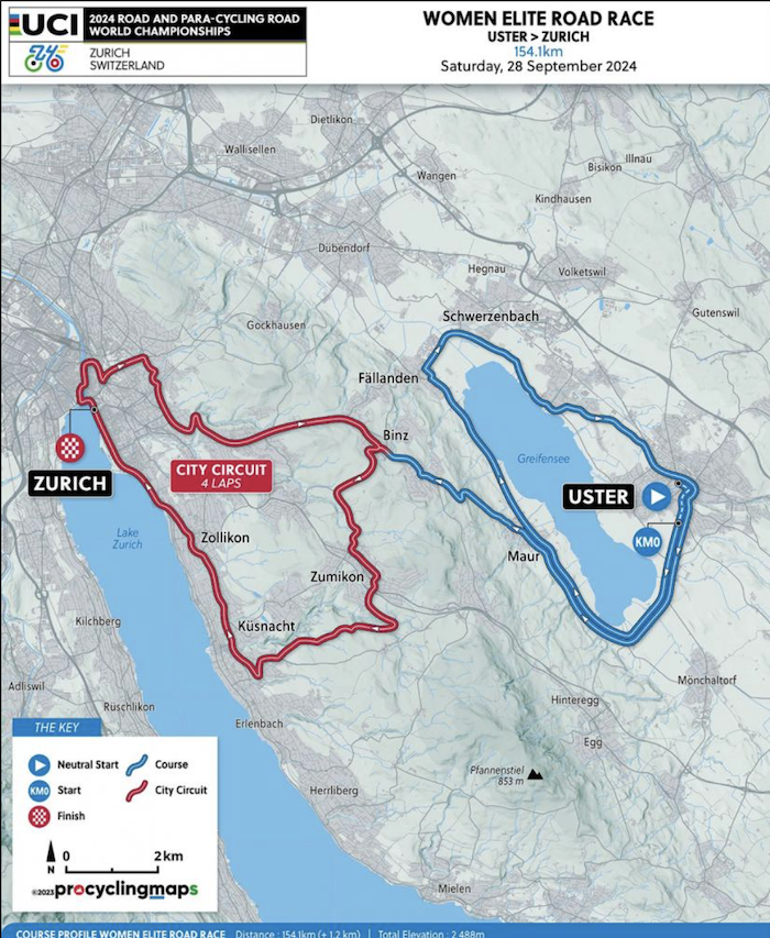 Le départ de la course féminine sera donné à Uster, comme pour toutes les autres catégories, avant de rejoindre le circuit final, où quatre tours seront à effectuer, pour un total de 154,1 km avec 2488 m de dénivelé.