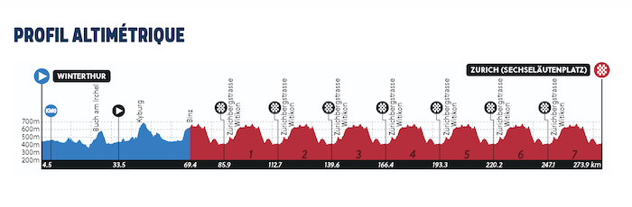 La course Elite masculine sera lancée depuis la localité de Winterthour dans le canton de Zurich. Après une première boucle d’environ 40 km et 400 m de dénivelé, le parcours se dirigera vers Zurich avec une première véritable difficulté (12 % de pente moyenne, 16 % max) avant l’entrée sur le circuit final au km 69. Sept tours de 26,850 km avec un dénivelé de 409 m seront ensuite à effectuer. Ce circuit comporte une côte de 1,1 m à 8,6 % (avec un court passage à plus de 15 % au sommet), et une côte de 2,3 km à 5,7 %, avant un faux plat de 800 m à 3,6 % à l’approche de la ligne d’arrivée. 273,9 km avec 4470 m de dénivelé sont au programme.
