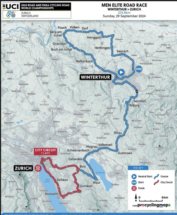 La course Elite masculine sera lancée depuis la localité de Winterthour dans le canton de Zurich. Après une première boucle d’environ 40 km et 400 m de dénivelé, le parcours se dirigera vers Zurich avec une première véritable difficulté (12 % de pente moyenne, 16 % max) avant l’entrée sur le circuit final au km 69. Sept tours de 26,850 km avec un dénivelé de 409 m seront ensuite à effectuer. Ce circuit comporte une côte de 1,1 m à 8,6 % (avec un court passage à plus de 15 % au sommet), et une côte de 2,3 km à 5,7 %, avant un faux plat de 800 m à 3,6 % à l’approche de la ligne d’arrivée. 273,9 km avec 4470 m de dénivelé sont au programme.