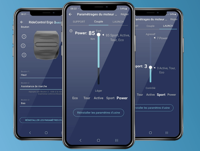 Le système est relié à une application nommée Giant RideControl App (téléchargeable gratuitement sur App Store et le Play Store) qui permet de connecter le téléphone au vélo pour personnaliser le pourcentage d’assistance du moteur, la vitesse de déclenchement de l’assistance sur 11 niveaux et le couple en fonction des préférences ou de l’utilisation. On peut imaginer en effet un réglage différent pour une utilisation en montagne ou en zone urbaine, afin de favoriser par exemple le couple maximum lors des relances au milieu de la circulation. L’application offre également un contrôle sur le feu arrière intégré du vélo, un diagnostic sur l’état de chacun des composants du système, ou encore un suivi de toutes les statistiques de vos sorties avant un partage sur les réseaux sociaux comme Strava par exemple.