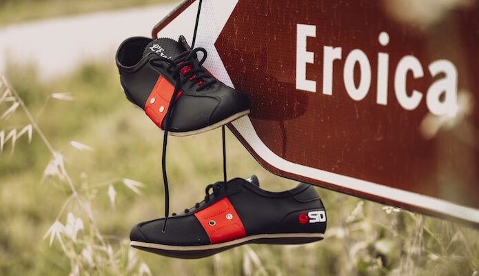 Sidi a créé et produit la chaussure Tenacia , un modèle spécialement conçu pour l’Eroica, reflétant l’héritage de la marque. Elle rappelle notamment les années 1970, lorsque l’entreprise a inventé le premier clip à monter sous la chaussure. C’est un clin d’œil à la tradition dans sa construction, son esthétique et sa fonctionnalité, mais avec des matériaux modernes . Elle est fabriquée en microfibres, avec une forme spécialement effilée et dispose d’une semelle plate à utiliser avec le cale-pied du vélo. Le logo Sidi est brodé sur le talon et le logo Eroica est brodé sur la languette.