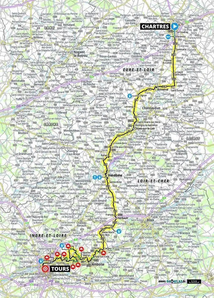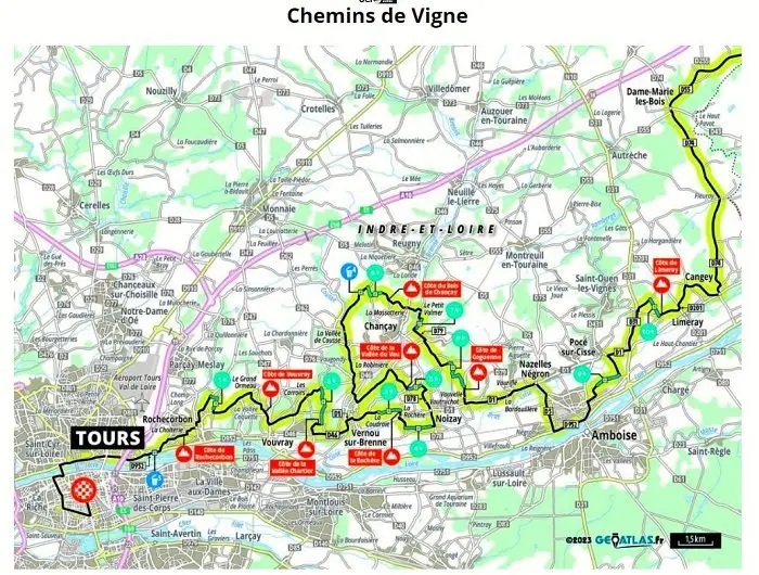 Paris-Tours 2024, une des dernières classiques de la saison, se déroule dimanche 6 octobre, entre Chartres et Tours sur 213,5 km. Elle propose un parcours plat mais exposé au vent et 10 km de chemins de vigne répartis en 10 secteurs. En 2021 et 2022, le Français Arnaud Démare s’était imposé tandis que l’édition 2023 a vu la victoire de l’américain Riley Sheehan, à la surprise générale. Le Picard sera très motivé pour reprendre son bien, mais des coureurs très rapides au sprint seront également de la partie tels que Jasper Philipsen, Mads Pedersen et Arnaud De Lie. Côté Français, les chances de victoires seront aussi à chercher du côté de Christophe Laporte ou Anthony Turgis. Retrouvez la carte du parcours, le profil, la liste des chemins de vigne, les horaires de diffusion TV et les équipes engagées sur cette 118e édition.