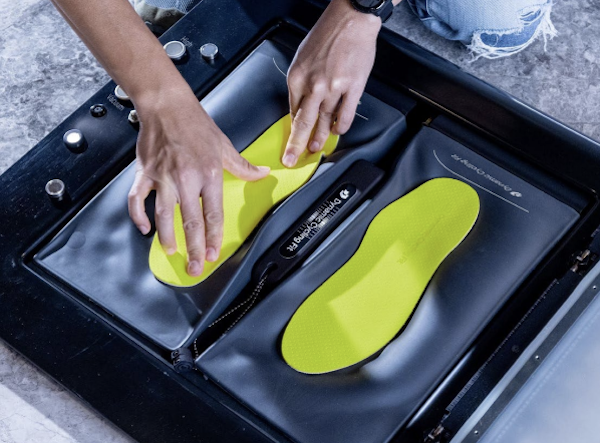 L’étape suivante concerne le réglage des cales et le choix de la selle, pour assurer confort et transfert de puissance. L’opérateur peut proposer d’opter pour des semelles thermorformées DCF, moulées directement à partir des pieds, qui offrent une répartition plus équilibrée du poids du corps, et évitent des tensions et de l’inconfort.