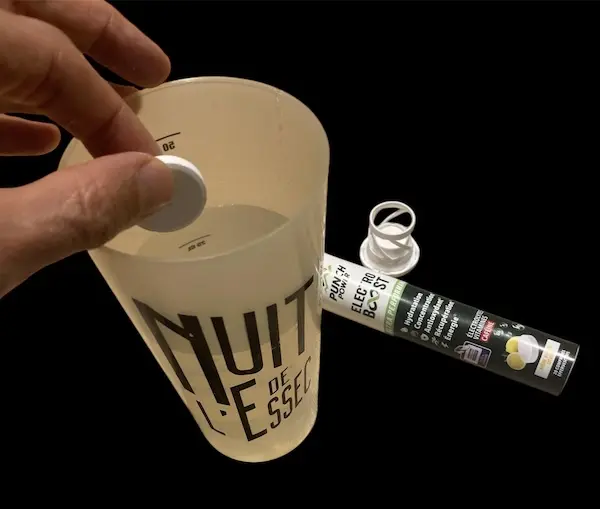 - Dissolvez 1 comprimé dans un grand verre d’eau ou dans votre bidon (environ 500 à 700ml).