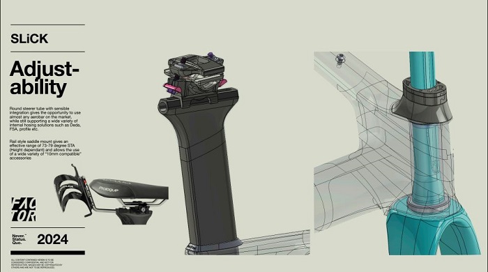 Factor a opté pour un tube de direction standard de 1″ 1/4 afin que le SLiCK soit facile à personnaliser pour un ajustement parfait et rapide à transporter, ce qui en fait le choix idéal pour les athlètes qui voyagent fréquemment et cherchent à optimiser leur position sans tracas. L’utilisation d’un support de selle de type rail offre également une plage efficace de 73 à 79° (en fonction de la hauteur) et permet l’utilisation d’une grande variété d’accessoires compatibles.
