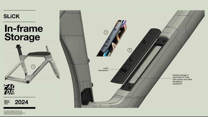 Le rangement intégré dans le cadre avec un mécanisme de verrouillage pratique permet un accès facile aux essentiels sans sacrifier l’aérodynamisme. De plus, le système d’hydratation du vélo est stratégiquement positionné dans la potence pour minimiser la traînée.