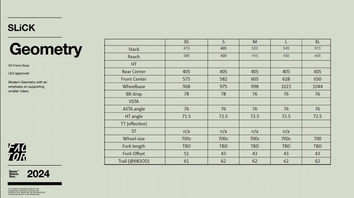 L’expertise interne de Factor a permis de créer une structure légère et réactive pesant seulement 1 250 g pour le cadre et 459 g pour la fourche (pour un modèle de 54 cm), conçue pour aider les cyclistes à s’adapter aux distances plus longues et à maintenir la fluidité et la rigidité exigées par les athlètes de haut niveau. .