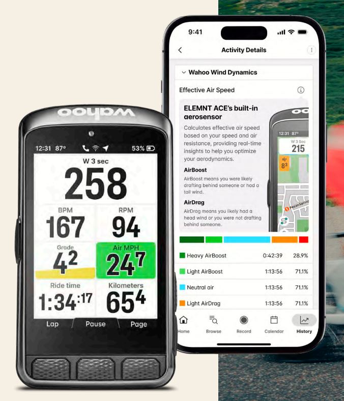 Le capteur de pression de l’ELEMNT ACE suit la résistance de l’air en temps réel, affichant aux cyclistes les métriques AirBoost et AirDrag en direct pour optimiser les performances. Après la sortie, Wahoo Wind Dynamics™ fournit des informations sur le vent via l’application Wahoo.