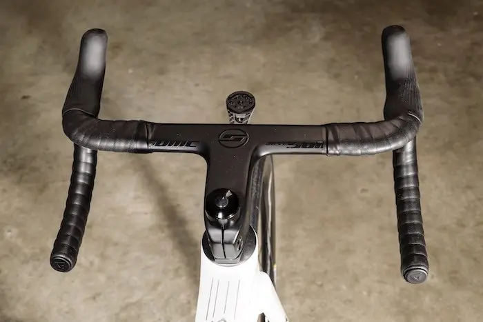 Ce n’est pas le cas ici, même si j’ai été un peu gêné lors des toutes premières sorties avec le vélo par la largeur de 38 cm du guidon : une étroitesse justifiée pour optimiser une position aérodynamique, mais qui offre de ce fait moins de bras de levier lorsqu’on se met en danseuse. Il m’a donc fallu quelque temps pour m’adapter à cette dimension et fluidifier mon geste de balancement en danseuse.