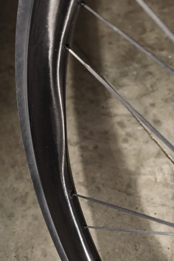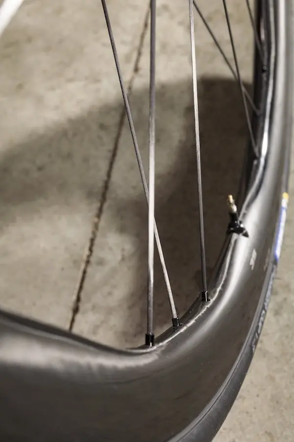 Mais surtout, ces roues ne sont pas exceptionnellement raides latéralement, ce qui leur permet ici de tempérer un peu la rigidité du vélo et de le rendre un peu plus accessible qu’avec des jantes plus hautes, de 50 mm par exemple.