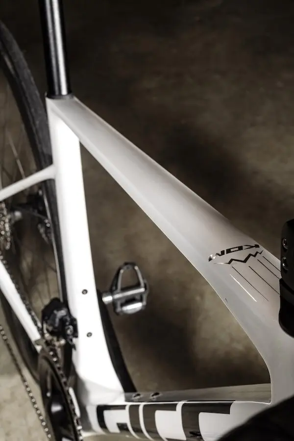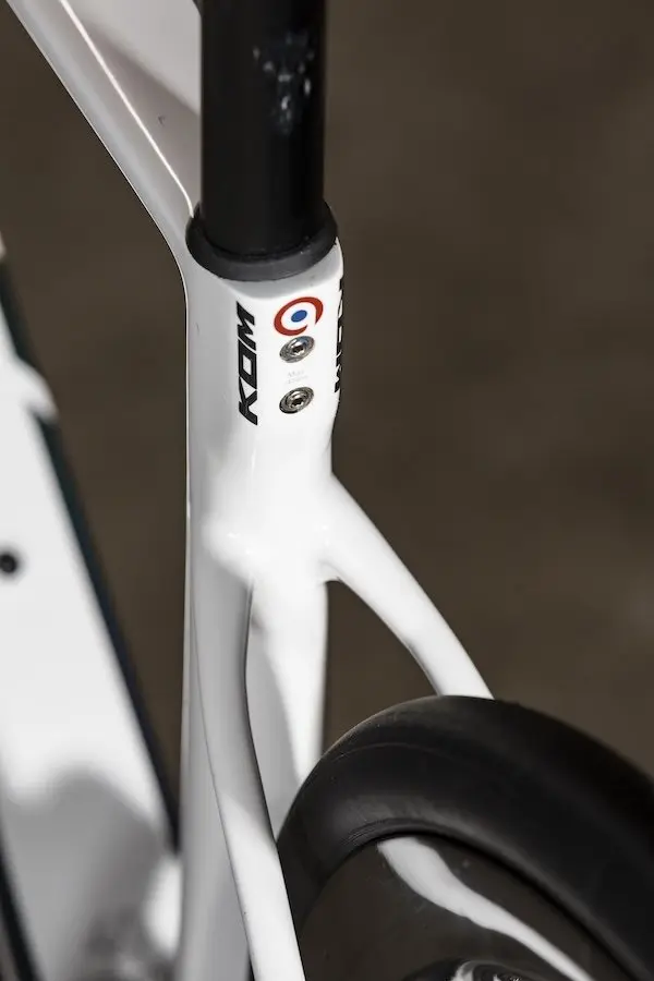 Il existe une autre déclinaison du cadre au catalogue : le Kom R, avec des fibres de carbone M40X chargées de nanoparticules de carbone et de graphène, pour un poids de 790 g et un prix de 2990 €. De quoi monter un vélo haut de gamme en Shimano Dura-Ace avec un poids autour de 7,1 kg, pour un prix de 9775 €.