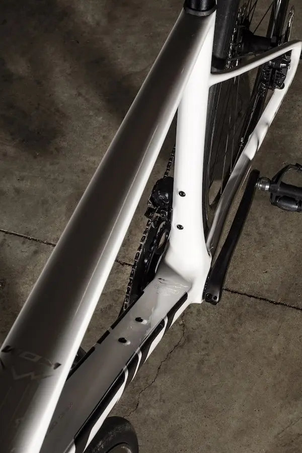 Le tube supérieur aplati s’affine légèrement en se rapprochant de la jonction avec le tube de selle, rond mais creusé au niveau du passage de la roue arrière. Les bases sont larges et anguleuses, et s’évasent pour suivre le parapluie du rayonnage de la roue.