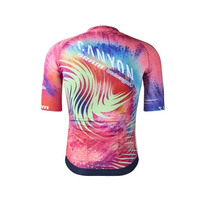 En plus d’un logo central Canyon, la collection de vêtements comprend également les logos du nouveau partenaire principal Zondacrypto, ainsi que de SRAM, qui fournit les transmissions et freins haut de gamme RED eTap AXS de l’équipe, et de Zwift, dont le concours annuel Zwift Academy donne aux coureurs la chance de gagner un contrat avec Canyon/SRAM Zondacrypto.