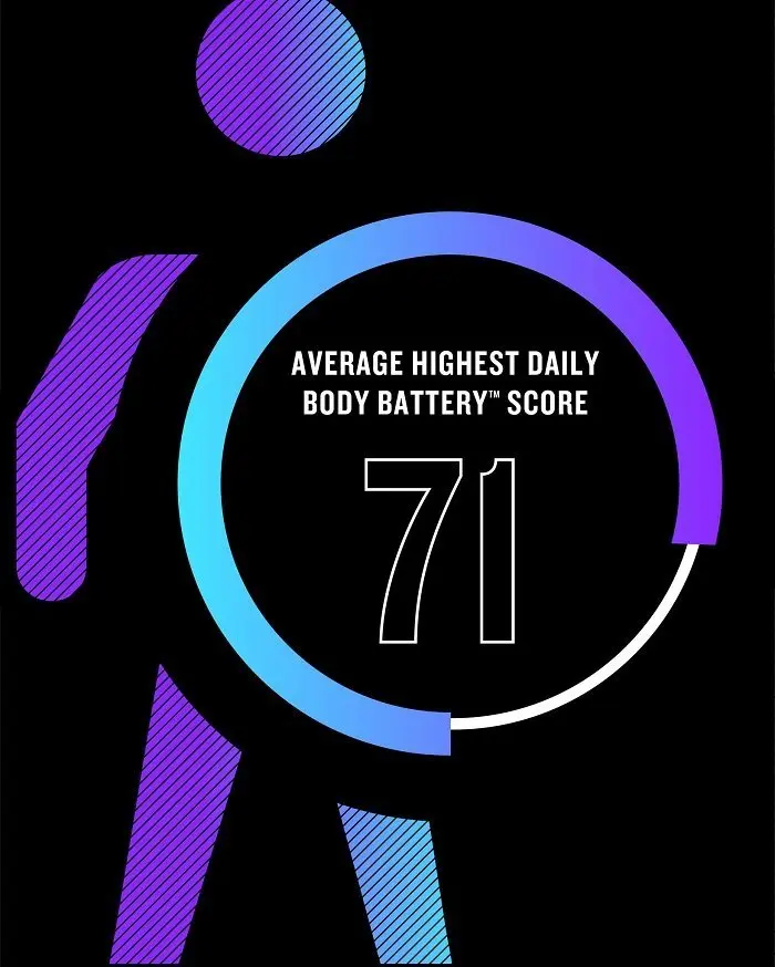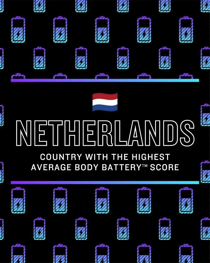 • Niveau de Body Battery moyen : 71. Les utilisateurs Garmin ont plus d’énergie le mardi, tandis que le samedi est généralement le jour où l’activité est la plus faible. Les Pays-Bas enregistrent le score moyen de Body Battery le plus élevé, tandis que le Japon a la moyenne la plus faible.