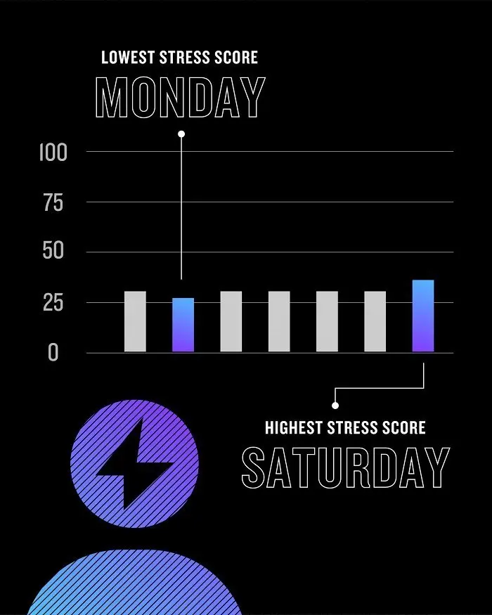 • Score de stress moyen : 30. Le lundi est le jour le moins stressant de la semaine, tandis que les scores les plus élevés sont enregistrés le samedi. Cette année, la Malaisie enregistre le score de stress le plus élevé, contrairement à la Corée du Sud, où il est le plus faible.