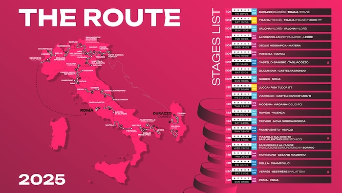 Pour la première fois de son histoire, le Giro s’élancera d’Albanie où se dérouleront les trois premières étapes de cette 108e édition. Après deux premières semaines de course qui appelleront sans doute de nombreux rebondissements, dont la 9e étape entre Gubbio et Sienne qui intègrera 30 km de chemins blancs, et la 11e étape avec l’ascension de l’Alpe San Pelligrino, c’est au cours de la dernière semaine que se jouera très certainement la course. Quatre étapes qui s’annoncent en effet très difficiles avec des arrivées au sommet à San Valentino (16e étape), à Bormio (17e étape), à Champoluc (19e étape) et à Sestrières (la veille de l’arrivée finale) après avoir grimpé le Colle delle Finestre (2178 m, dont une partie de l’ascension en chemin empierré).