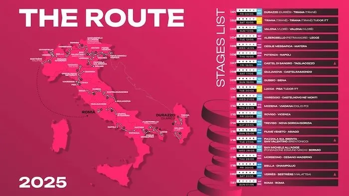 Partager la publication "Giro 2025 : un départ d’Albanie, un passage en Slovénie, des routes blanches en Toscane et un retour sur le Colle delle Finestre"