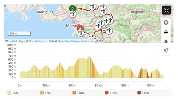L’arrivée est prévue vers 17h10, avenue de Luminy, à Marseille, après un parcours de 164 km. La course passera par les lieux suivants : Col de Mimet, Gréasque, Peynier, Trets, Pas de la Couelle (GPM), Sainte-Zaccharie, Sommet de la Sambuc, Nans-les-Pins, Hostellerie Sainte-Baume, Plan d’Aups, Col de l’Espigoulier (GPM), Gémenos, Col de l’Ange, Cuges-les-Pins, Le Camp du Castellet, La Bégude, Côte des Bastides, Roquefort-la-Bédoule, Pas d’Ouillier, La Ciotat, Route des Crêtes (GPM), Cassis, Col de la Gineste.