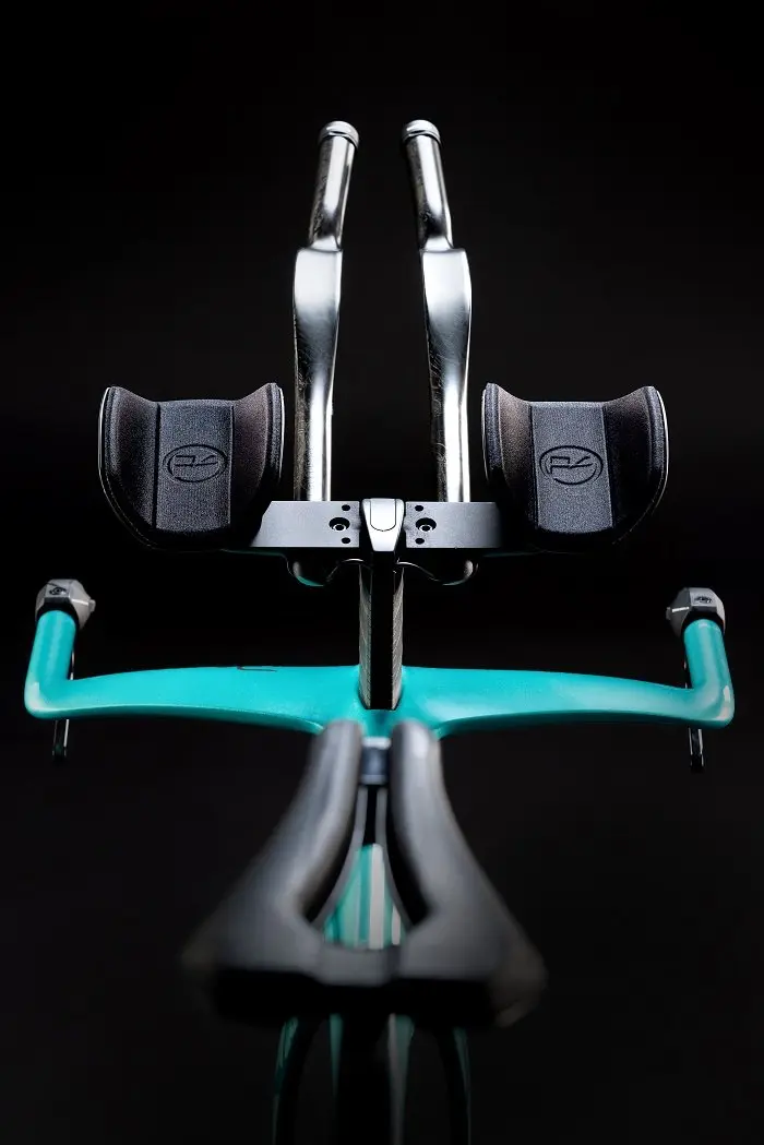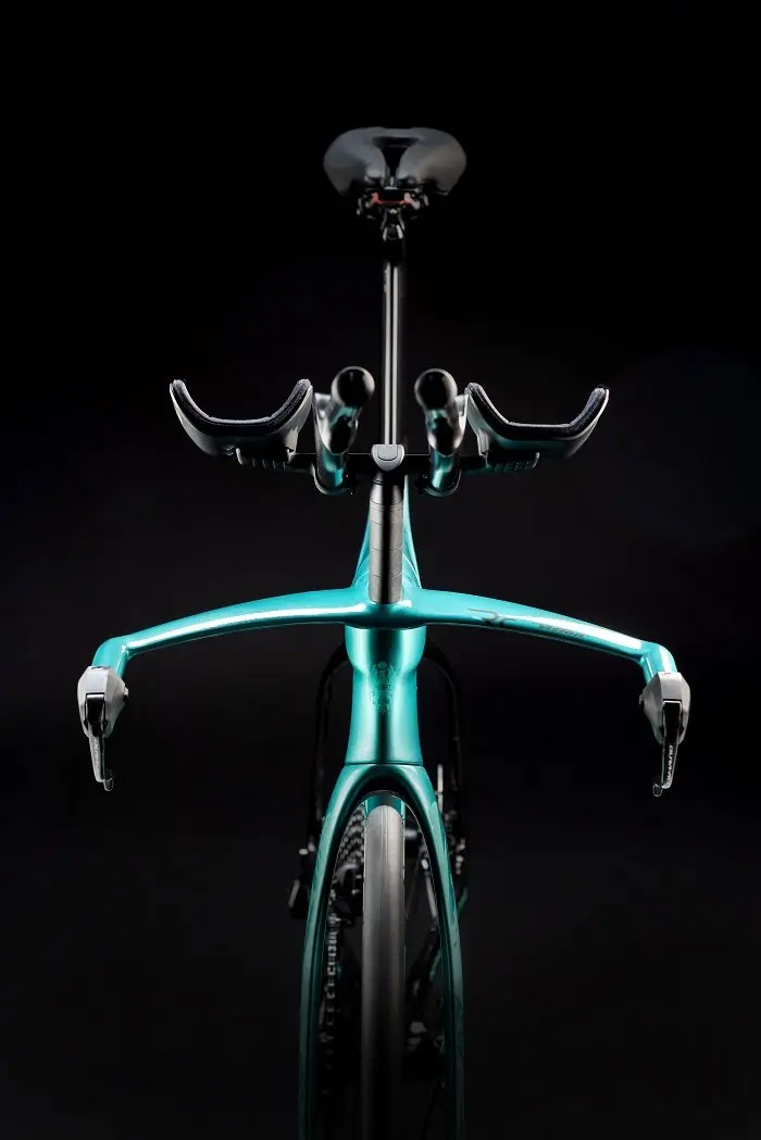 Après une analyse approfondie des données, le Bianchi Reparto Corse a opté pour un angle de tube de selle de 77,5° – pour correspondre aux préférences des spécialistes du contre-la-montre du WorldTour – combiné à une portée accrue. La conséquence est une position de conduite plus rapide et plus agressive.