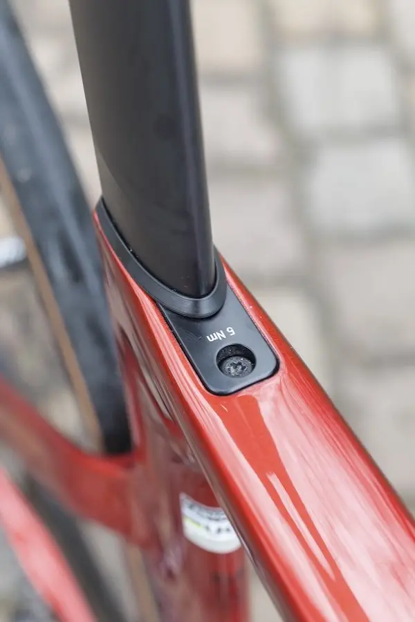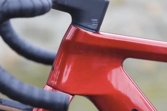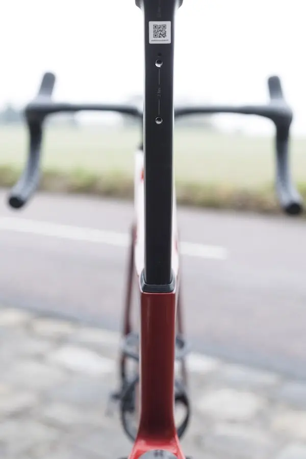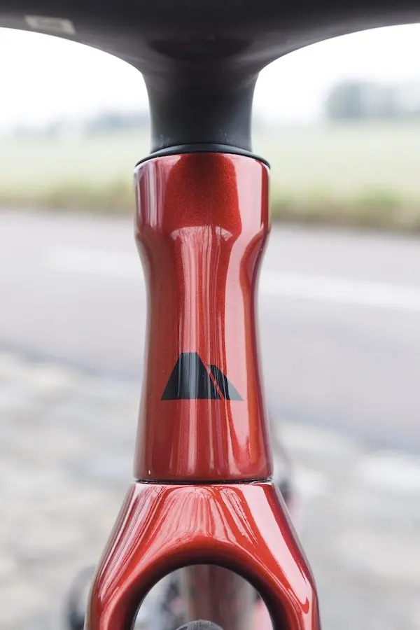 Sur ce nouveau modèle, le tube et la tige de selle et les haubans ont été légèrement affinés. En revanche, le tube horizontal est un peu plus large. Entre la douille de direction et le tube diagonal, un léger déport est un peu plus marqué que sur le modèle que nous avions testé en 2023. De profil, le vélo surprend donc un peu, surtout en taille XS, avec un dégagement entre la roue avant et le tube diagonal beaucoup plus important que sur certaines vélos concurrents.