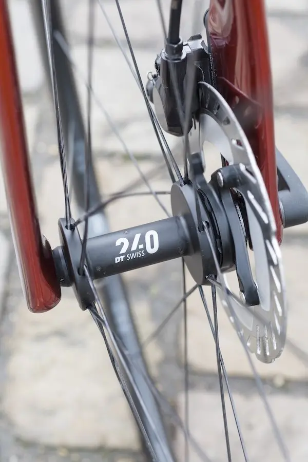 Tous les câbles sont bien évidemment dissimulés à l’intérieur du cadre et du cockpit, réduisant la traînée et offrant une esthétique épurée. Enfin, les roues DT Swiss Arc 1400 avec un profil de 50 mm de haut font partie intégrante du projet. Elles sont aussi conçues en collaboration avec les spécialistes en aérodynamique Swiss Side. Elles semblent parfaitement convenir au vélo, notamment en termes de stabilité sous des vents de travers.