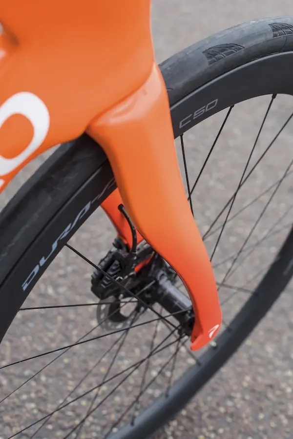 - La nouvelle fourche Onda, emblématique de Pinarello, adopte un design plus effilé avec un déport de 47 mm (contre 43 mm auparavant), améliorant à la fois l’aérodynamisme et la stabilité, notamment dans les descentes techniques.