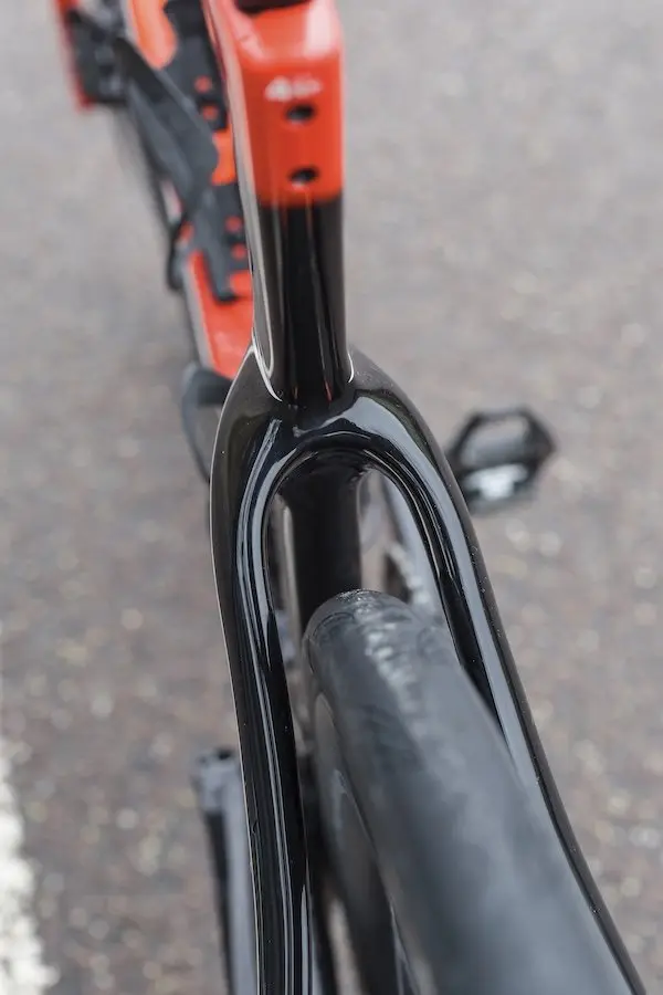 Et en parlant du poste de pilotage, il nous a fallu quelque temps pour nous habituer à l’évasement prononcé, avec une partie haute bien plus étroite que la partie basse. Une caractéristique qui apporte une position plus aérodynamique avec les mains aux poignées, mais aussi moins de bras de levier lorsqu’on se met en danseuse. Reste toutefois que sur le plan ergonomique, ce cockpit est très bien conçu. Tout semble tomber sous la main, de manière à accentuer sinon le confort du vélo, au moins le plaisir ressenti à chaque fois qu’on le chevauche.