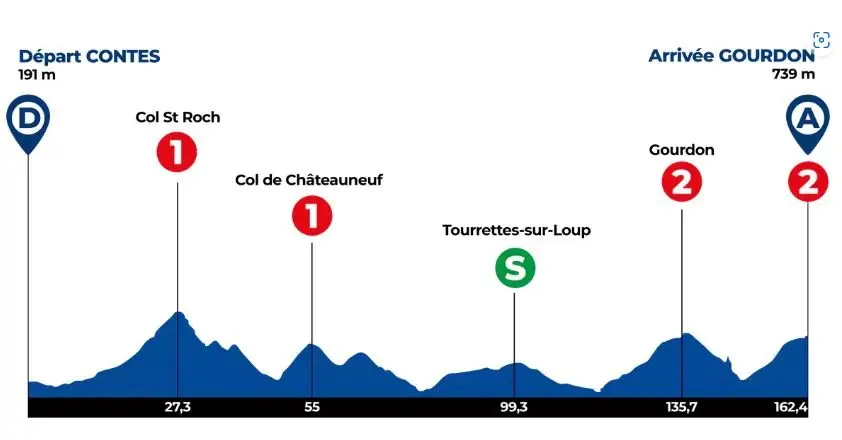 Le samedi 22 février, le peloton s’élancera de Contes, dans la vallée des Paillons pour ensuite franchir les cols de Saint-Roch depuis Lucéram et de Châteauneuf. Au terme de ces deux ascensions, l’arrivée se profilera à Gourdon après 162,4 kilomètres et 4 600 mètres de dénivelé positif.