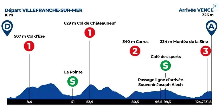 Le dimanche 23 février, au départ de Villefranche-sur-Mer, les coureurs emprunteront le Col d’Èze puis celui de Châteauneuf avant de redescendre le bois de la Sine. Ce parcours de 131 kilomètres et 3 400 mètres de dénivelé positif emmènera le peloton, pour la 3e année consécutive, à Vence avec un potentiel sprint final.