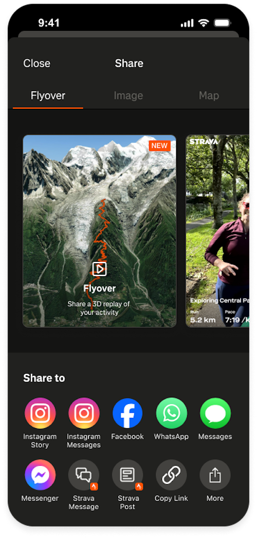 Partage hors-plateforme de Flyover : La fonctionnalité Flyover de Strava, une carte dynamique en 3D permettant de rejouer des activités, offre désormais des options de partage en dehors de l’application.