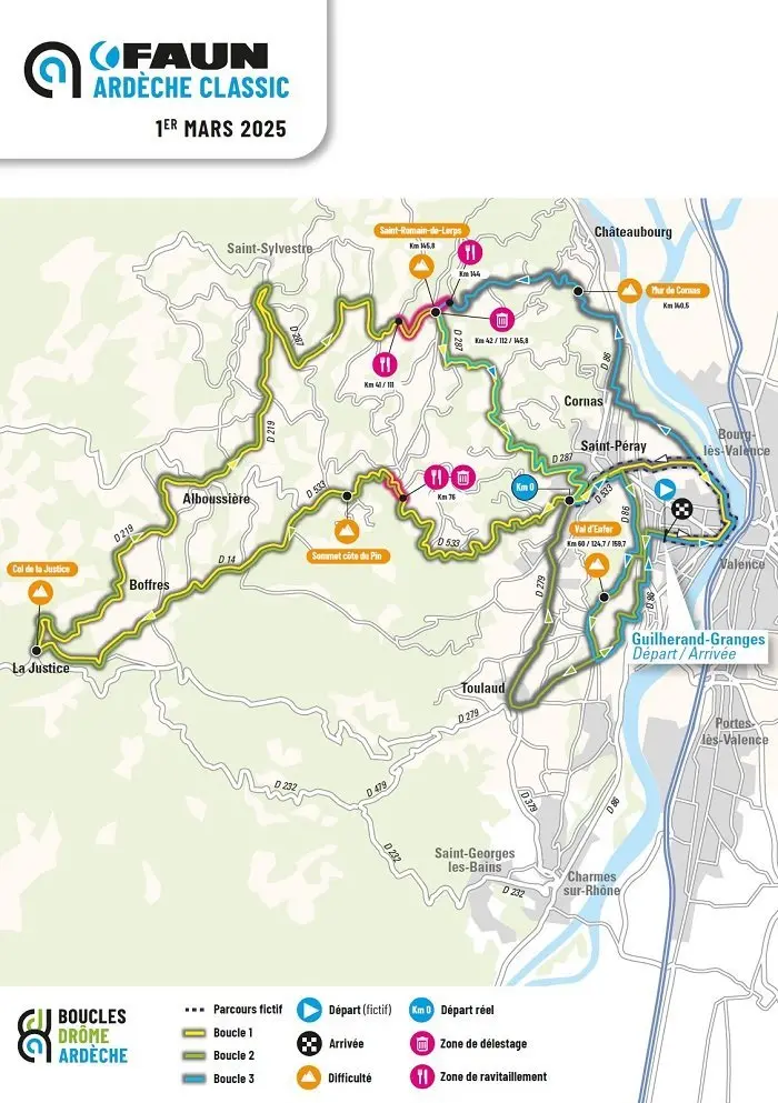 La 25e édition de la Faun Ardèche Classic s’élancera le samedi 1ᵉʳ mars 2025, avec un départ et une arrivée à Guilherand-Granges. Ce parcours de 168,5 km, cumulant 3100 mètres de dénivelé positif, mettra à nouveau les coureurs à rude épreuve avec notamment le terrible Val d’Enfer, à franchir trois fois.