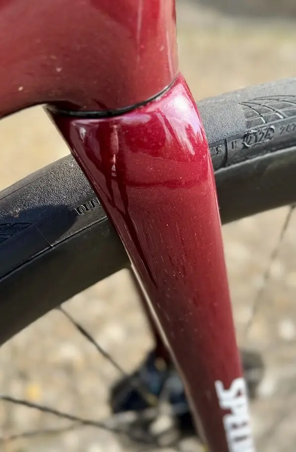 Aussi surprenant que cela puisse paraître, le poids du cadre Allez Sprint est en hausse par rapport à la première version de 2015. En taille 52, avec la peinture, le collier de serrage de selle, les pattes de dérailleur et les vis de porte-bidon, le cadre pèse 1500 g, soit environ 300 de plus que la précédente version. À titre de comparaison, c’est presque 800 g de plus qu’un S-Works Tarmac SL8 pesé dans les mêmes conditions.