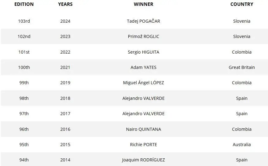 Les 10 derniers vainqueurs du Tour de Catalogne