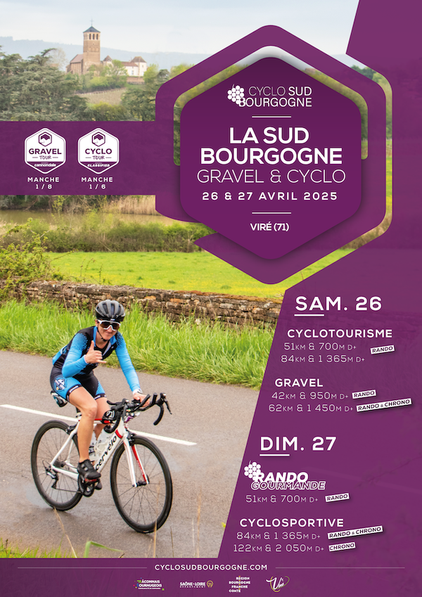 La Sud Bourgogne | Gravel & Cyclo se tiendra les 26 et 27 avril 2025 à Viré, marquant l’ouverture du Cyclo’Tour Classified et du Gravel’Tour Cannondale dans le cadre du Cycling Challenge. Cet événement, qui aura lieu dans 40 jours, invite les participants à explorer le Massif Sud Bourgogne, ses vignobles et ses paysages, tout en inaugurant la saison avec les premiers dossards.