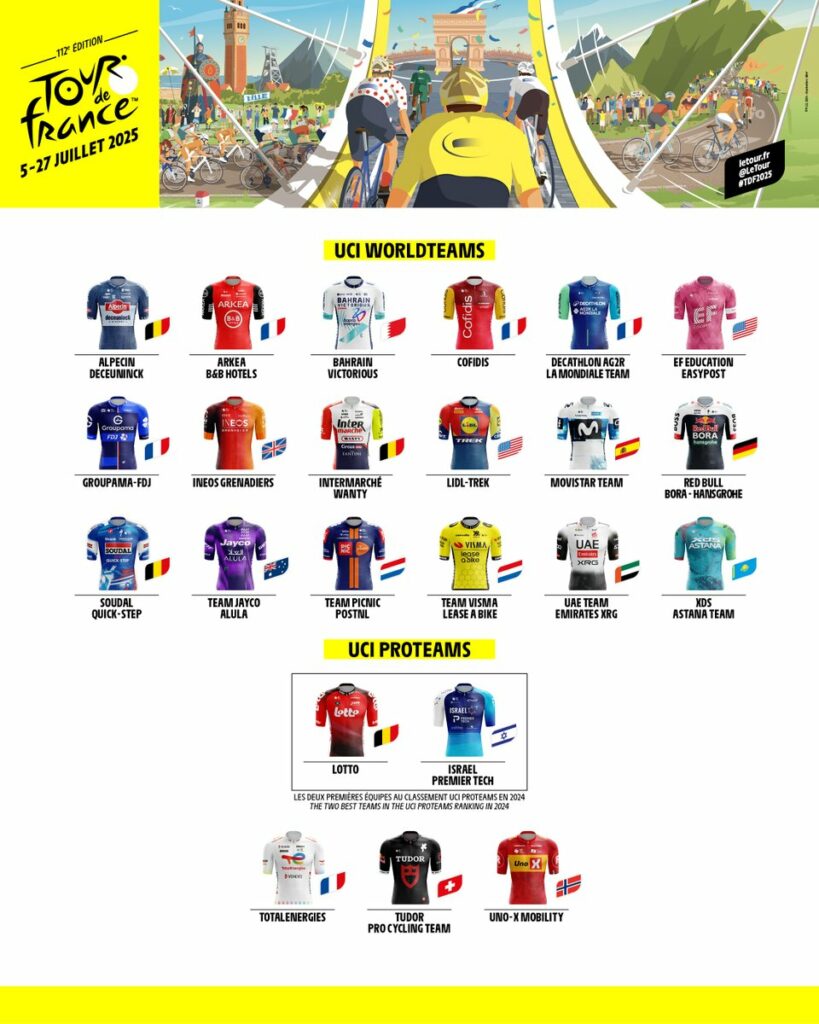 23 équipes et 184 coureurs seront donc au départ du Tour de France 2025. La sélection de l’équipe suisse Tudor permettra à Julian Alaphilippe de revenir sur le Tour, lui qui n’avait pas été sélectionné par son équipe Soudal Quick Step en 2024.