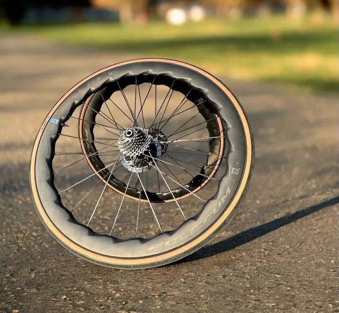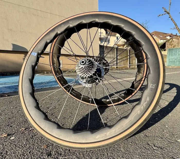 La caractéristique la plus marquante au premier abord des Fulcrum Sharq réside dans leur profil de jante inédit, baptisé 2-Wave Rim. Cette conception combine une onde symétrique près des rayons avec une onde asymétrique sur les flancs, créant une hauteur de jante oscillant entre 42 et 47 mm. Ce choix n’est pas purement esthétique : Fulcrum affirme que cette forme réduit l’instabilité provoquée par les vents latéraux de 21 % pour des angles de 0 à 10° et jusqu’à 30 % entre 10 et 20°, par rapport à une jante traditionnelle de même hauteur.