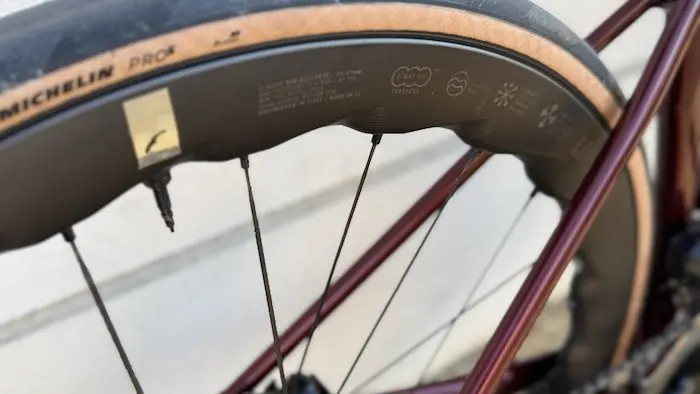 Mais quand on parle de polyvalence, on fait forcément des compromis. La jante large impose le montage d’un pneu large (de 30 mm ici), et en version tubeless le Michelin Pro 5 accuse tout de même 325 g sur la balance. Poids auquel il faut ajouter celui du liquide préventif. On arrive ici à 365 g environ pour le train roulant. Par rapport aux Mavic Cosmic carbone SLR en 45 mm avec des pneus Continental à chambre à air qui équipaient mon vélo jusque là, l’augmentation de poids est de 100 g environ sur la paire de roues, toutes choses étant égales par ailleurs. Et pour un prix équivalent.