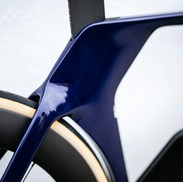 Tel qu’il est construit, le nouveau P5 est environ 5 watts plus rapide que l’ancien. Une grande partie de ce gain provient des roues – il n’y a pas beaucoup d’optimisation supplémentaire dans les limites de conception de l’UCI. Mais Cervélo a libéré de l’espace dans la fourche et entre les haubans pour faire de la place à une nouvelle génération de roues plus larges et plus rapides, comme la Reserve 77/88. Associées à un pneu de 29 mm, ces roues ne sont pas seulement plus aérodynamiques, mais le pneu de plus grand volume réduit également la résistance au roulement.