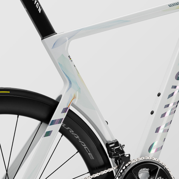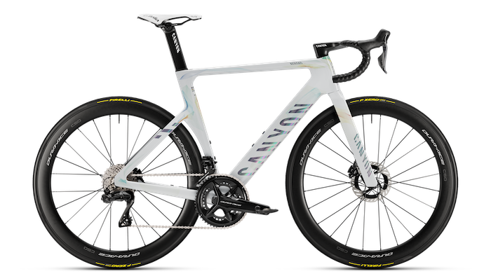 L’Aeroad CFR Tensor ne se contente pas d’afficher un design unique. Équipé du groupe Shimano Dura-Ace Di2 2×12, de freins à disques hydrauliques, de roues Dura-Ace C50 et de pneus Pirelli P-Zero Race TLR RS Team Edition, il est identique à celui utilisé par MVDP et l’équipe Alpecin-Deceuninck. Les stickers exclusifs Canyon Pro et la selle Selle Italia Flite Boost SF Carbonio MVDP complètent ce chef-d’œuvre.