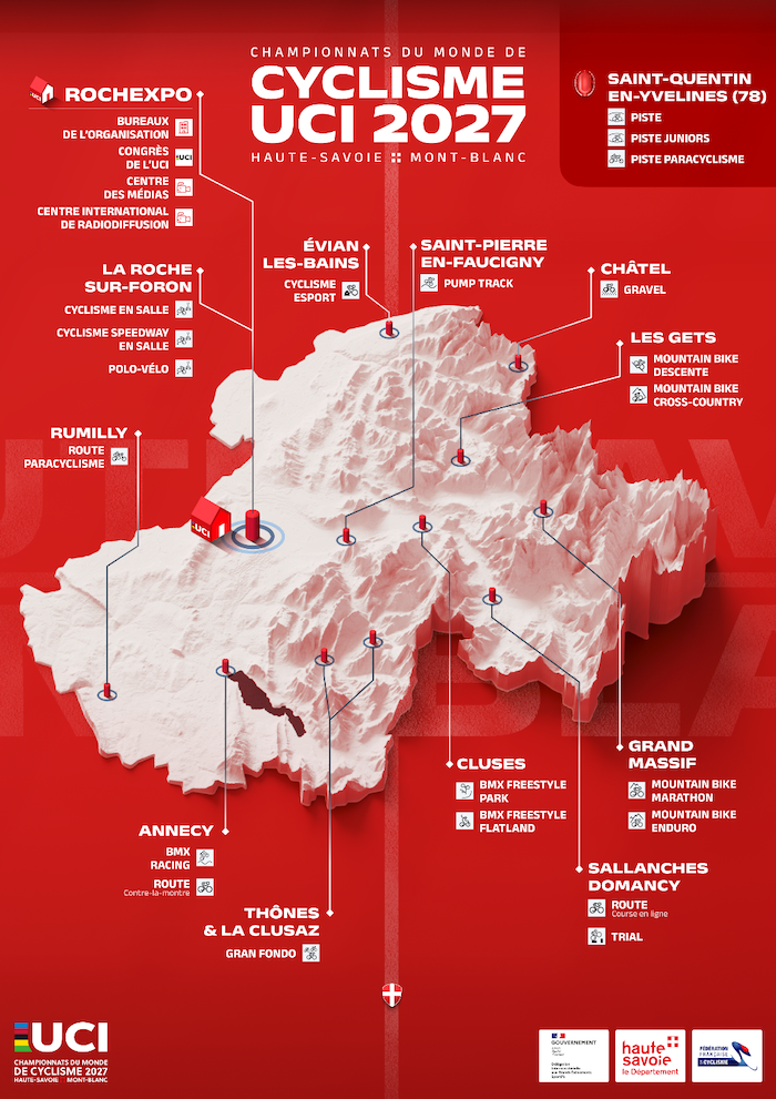 À un peu plus de deux ans de cet événement, la Haute-Savoie et la France ont dévoilé les grandes lignes de cette compétition d’exception. Réunissant 20 Championnats du Monde UCI, elle accueillera 10 000 athlètes, attribuera 281 maillots arc-en-ciel et 843 médailles sur 13 jours. Cinq disciplines olympiques serviront également de qualifications pour les Jeux Olympiques de Los Angeles 2028. L’événement se veut inclusif, durable et accessible, rassemblant toutes les disciplines du cyclisme.